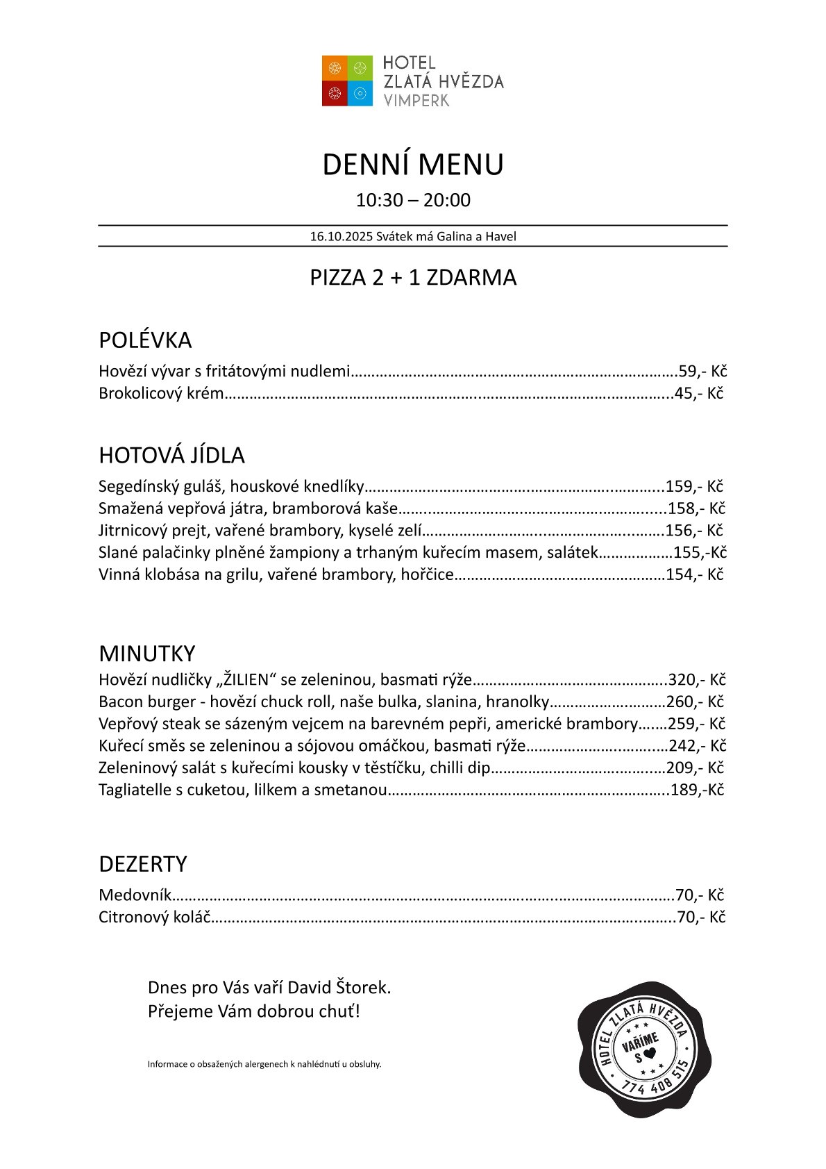Od pondělí do neděle pro Vás připravujeme hotová jídla a zvýhodňujeme ceny minutek. Některá jídla se mohou vyprodat, proto nám neváhejte kdykoliv zavolat pro aktuální nabídku na tel. rozvozu 774 408 515. Děkujeme a přejeme Vám dobrou chuť.